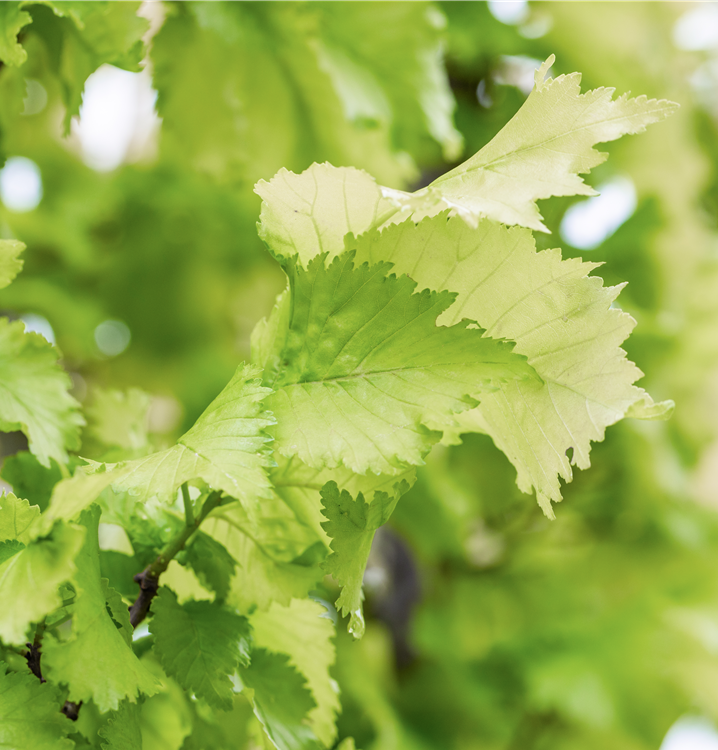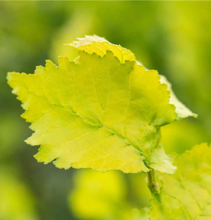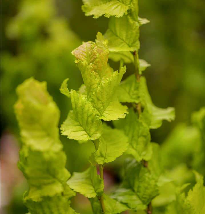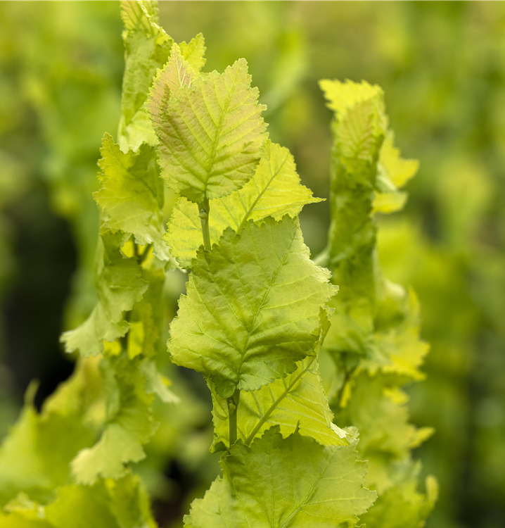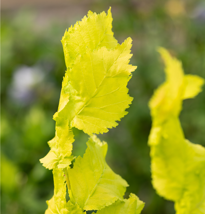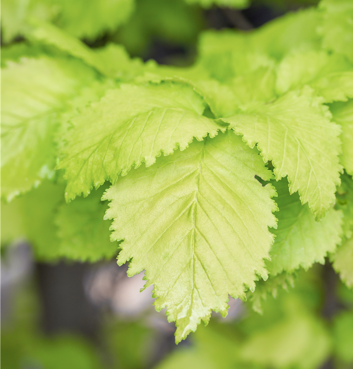 Hoher Blattschmuckwert. Die sommergrünen Blätter der Säulen-Goldulme 'Wredei' sind grüngelb, eiförmig, gedreht, wechselständig, gewellt. Gelber Austrieb.