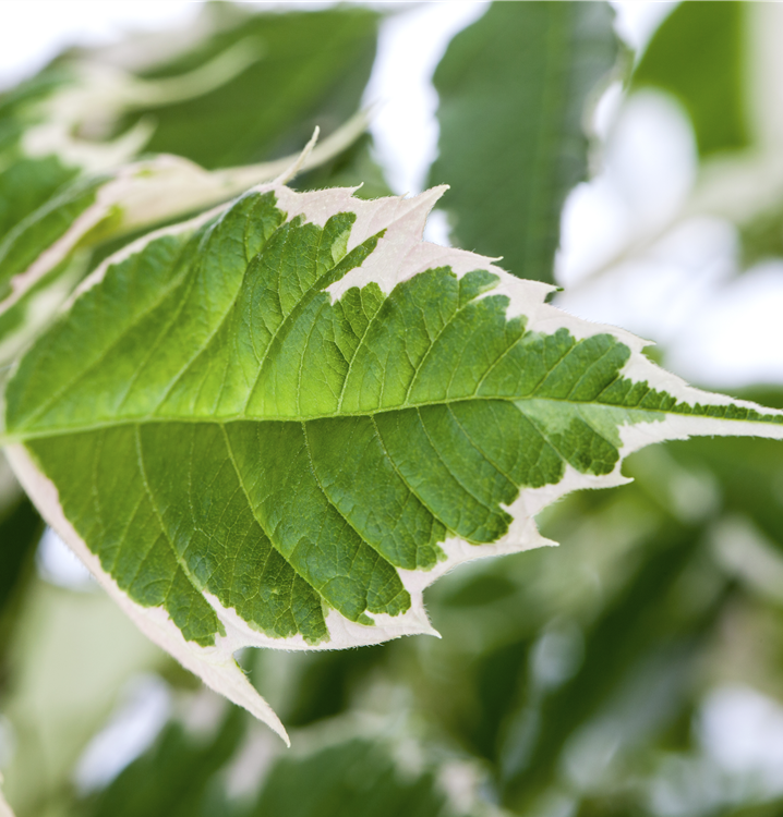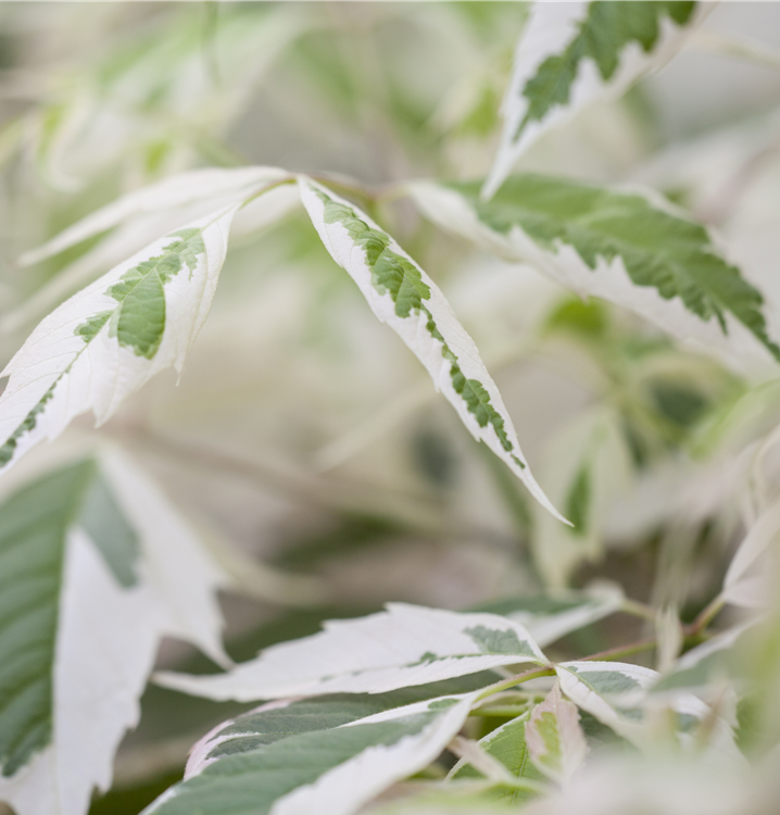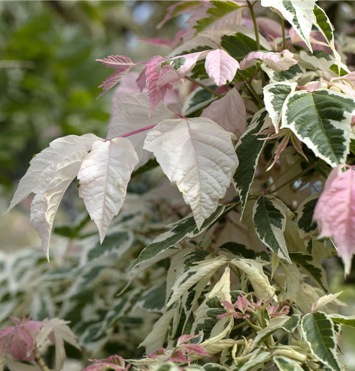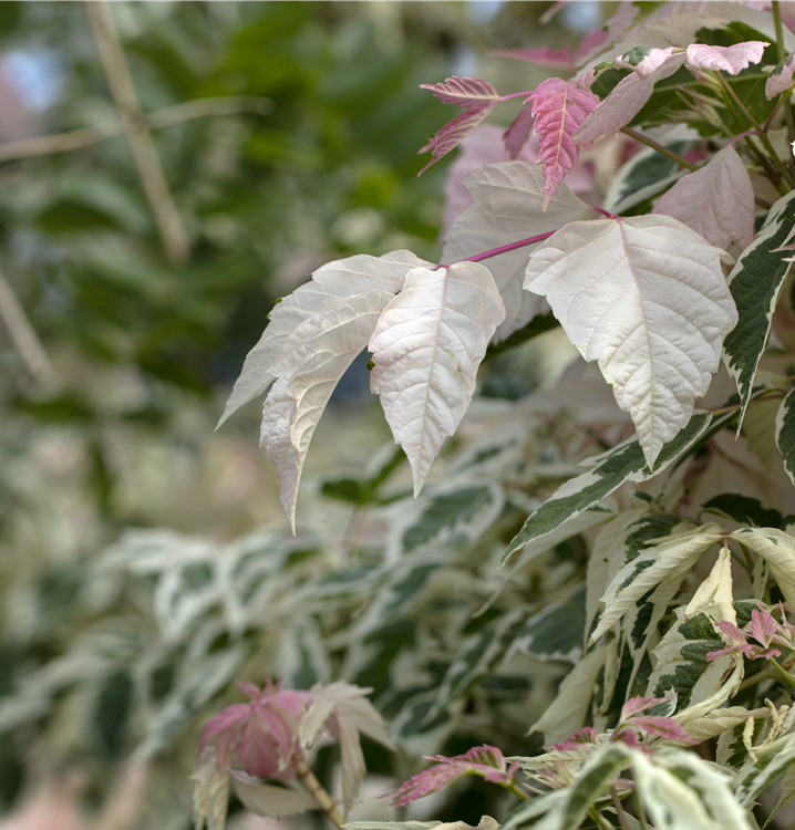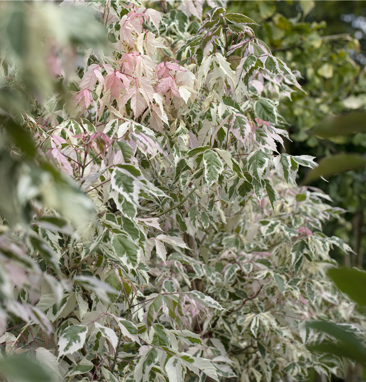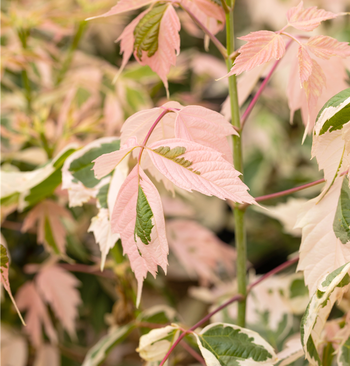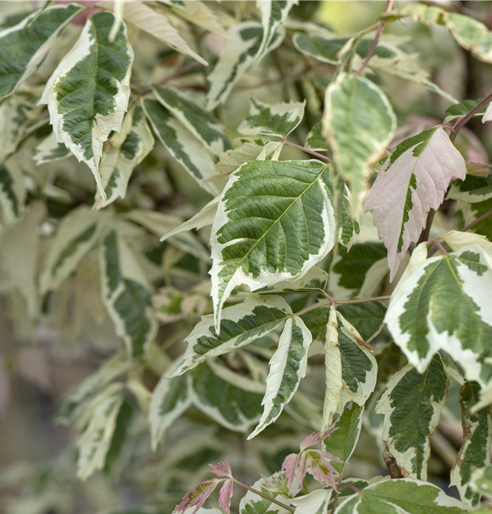Die sommergrünen Blätter des Eschenahorns 'Flamingo' sind grün, gefiedert, gegenständig und weisen einen weiß-rosafarbenen Rand auf. Rosafarbener Austrieb.
