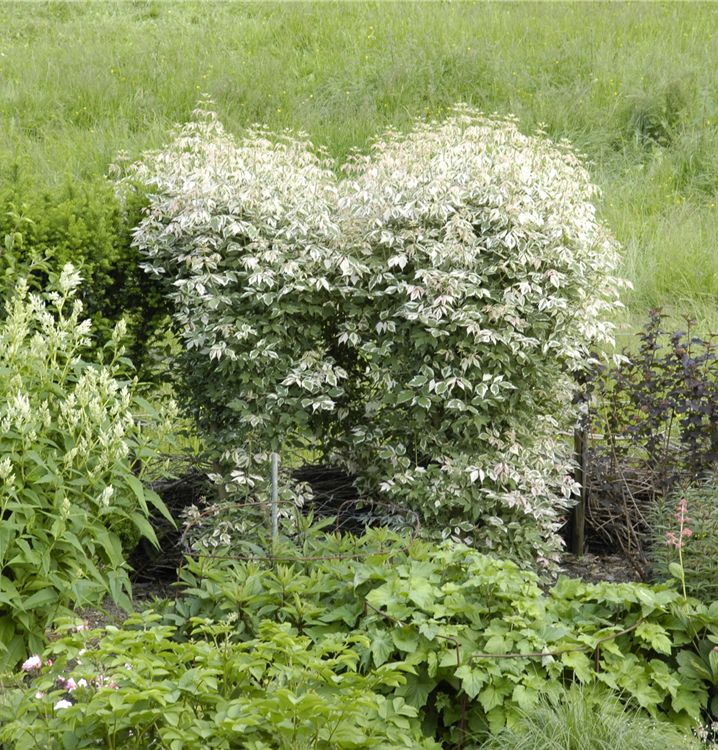 Der Eschenahorn 'Flamingo' (Acer negundo) ist ein buschiger, breiter Großstrauch, der cremeweiße, in Trauben angeordnete Blüten hervorbringt. Sie erscheinen im April. Zudem trägt der Eschenahorn 'Flamingo', gefiederte, grüne Blätter mit einem weiß-rosafarbenen Rand. Der rosafarbene Austrieb ist ebenso ein interessanter Anblick. An einem sonnigen Standort erreicht er gewöhnlich eine Höhe von ca. 7 m und wird ca. 6 m breit. An den Boden stellt der Eschenahorn 'Flamingo' keine besonderen Ansprüche.