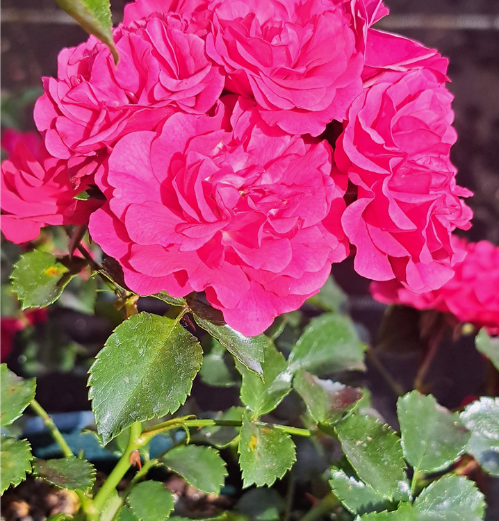 Die rosaroten, starkgefüllten, schalenförmigen Blüten der Bodendeckerrose 'Gärtnerfreude'® erscheinen in Dolden von Juni bis September. Diese werden etwa 2 - 3 cm groß.