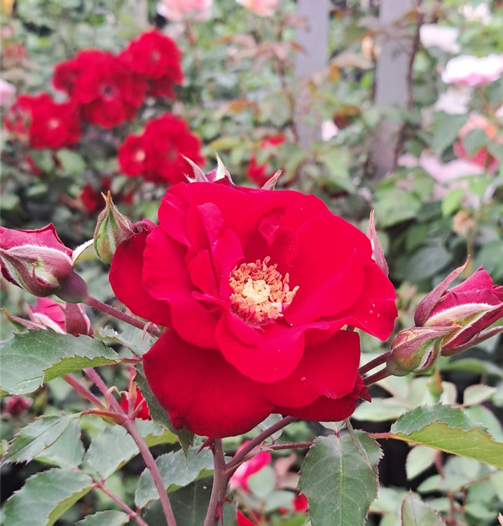 Die Strauchrose 'Roter Korsar'® setzt schöne Akzente gemeinsam mit: