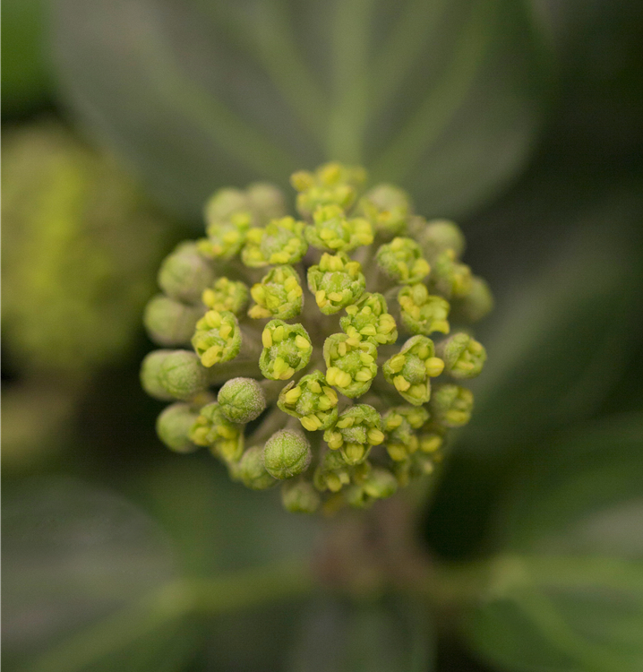 Die gelb-grünen Blüten des Strauch-Efeu 'Arborescens' erscheinen in Dolden von September bis Oktober.