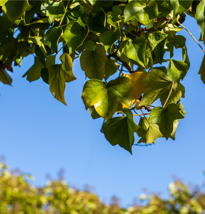 Die immergrünen Blätter des Strauch-Efeus 'Arborescens' sind dunkelgrün, herzförmig, glänzend. Diese sind etwa 5 - 12 cm groß.