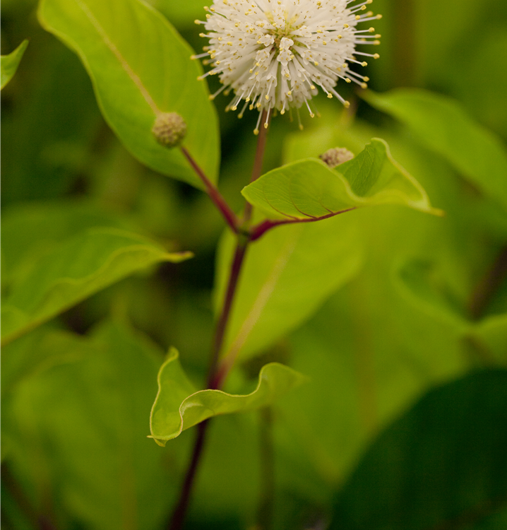 Der Knopfbusch 'Sugar Shack' (Cephalanthus occidentalis) ist ein dichter, kompakter Strauch mit dekorativen Früchten. Diesen voraus bringt er von Juli bis August weiße, ballförmige Blüten hervor. Zudem trägt der Knopfbusch 'Sugar Shack', glänzende, lanzettliche, mittelgrüne Blätter. An einem sonnigen bis halbschattigen Standort mit lehmigem, feuchtem bis nassem Boden erreicht er gewöhnlich eine Höhe von ca. 1,2 m und wird ca. 1,2 m breit.