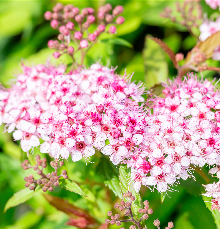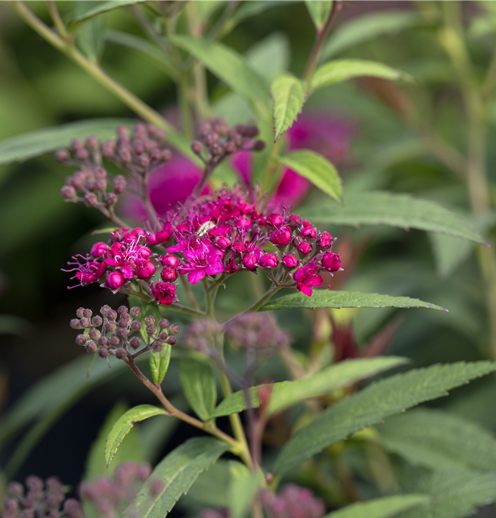 Die Sommerspiere 'Anthony Waterer' (Spiraea japonica) ist ein kompakter, aufrechter, dichter Kleinstrauch, der magentafarbene, in Trugdolden angeordnete Blüten hervorbringt. Sie erscheinen von Juli bis September. Zudem trägt die Sommerspiere 'Anthony Waterer', lanzettliche, hellgrüne Blätter. Der rote Austrieb ist ebenso ein interessanter Anblick. An einem sonnigen bis halbschattigen Standort mit durchlässigem Boden erreicht sie gewöhnlich eine Höhe von ca. 80 cm und wird ca. 80 cm breit.
