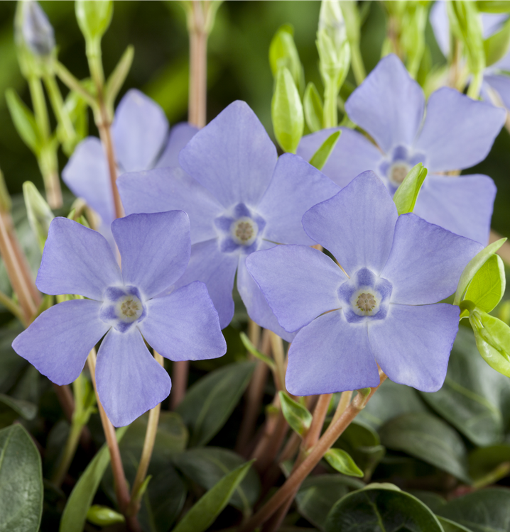 Das Kleinblättrige Immergrün (Vinca minor) ist eine kriechende, teppichartige, immergrüne Staude mit dekorativen, glänzenden, ledrigen, lanzettlichen, dunkelgrünen Blättern. Von Mai bis Juni trägt es blaue, radförmige Blüten. Wiederholte Blüte kommt bei richtiger Pflege im September vor. An einem sonnigen bis schattigen Standort mit durchlässigem, humosem, lockerem Boden erreicht es gewöhnlich eine Höhe von ca. 30 cm und wird ca. 50 cm breit. Das Kleinblättrige Immergrün ist gut frostverträglich.