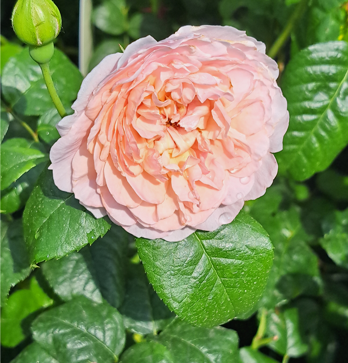Die sommergrünen Blätter der Englische Rose 'Strawberry Hill'® sind dunkelgrün, gefiedert, wechselständig.