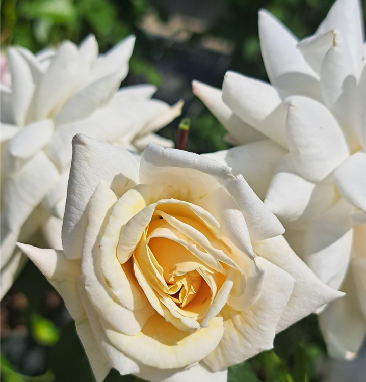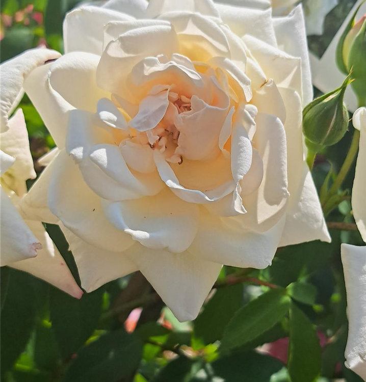 Die weißen, schalenförmigen Blüten sind starkgefüllt und erscheinen von Juni bis Oktober. Diese werden etwa 8 - 10 cm groß und sind angenehm duftend.