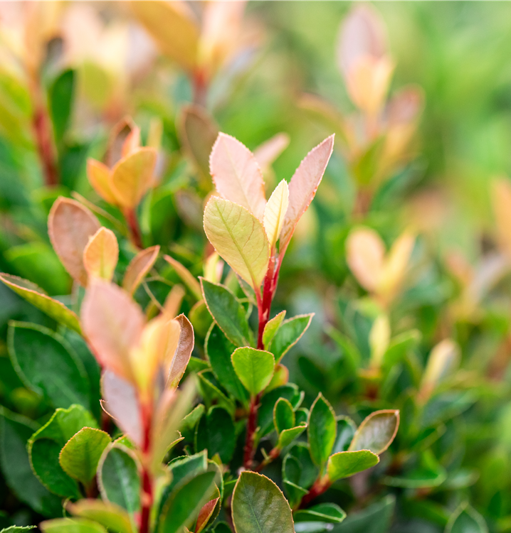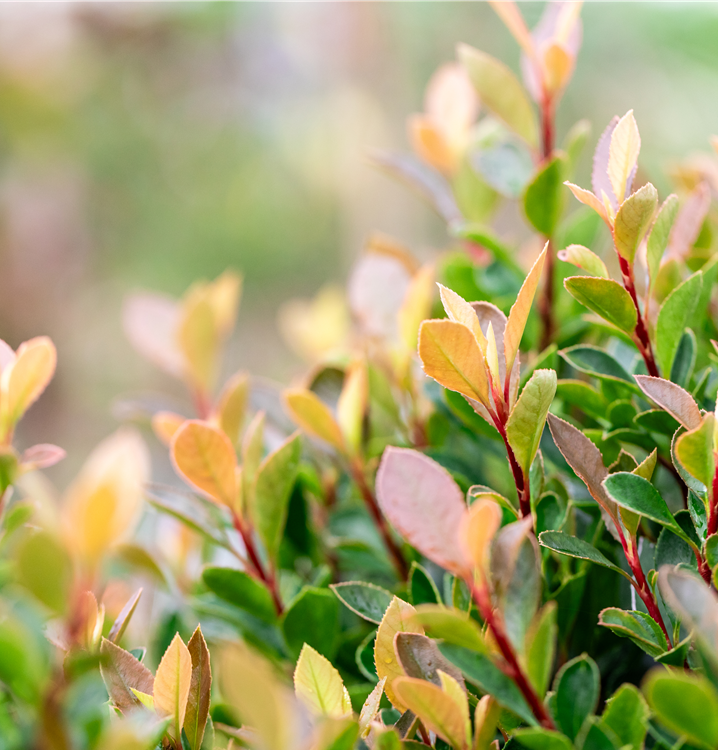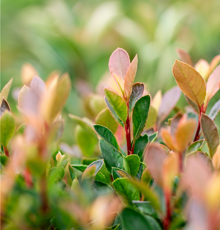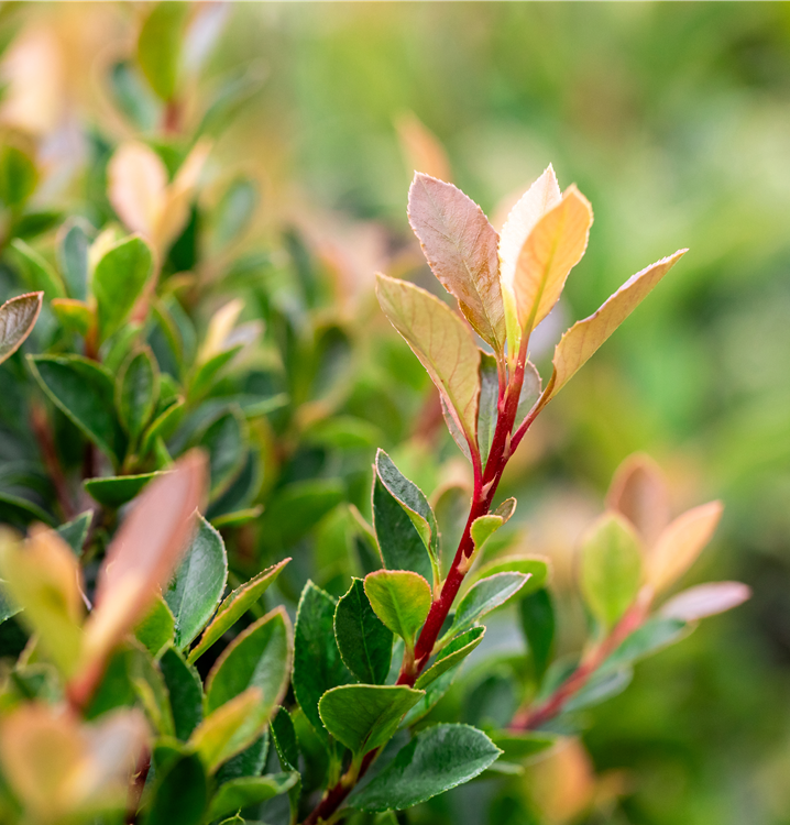 Die immergrünen Blätter der Glanzmispel 'Chico'® sind dunkelgrün, lanzettlich, gezähnt. Kupferbrauner Austrieb.