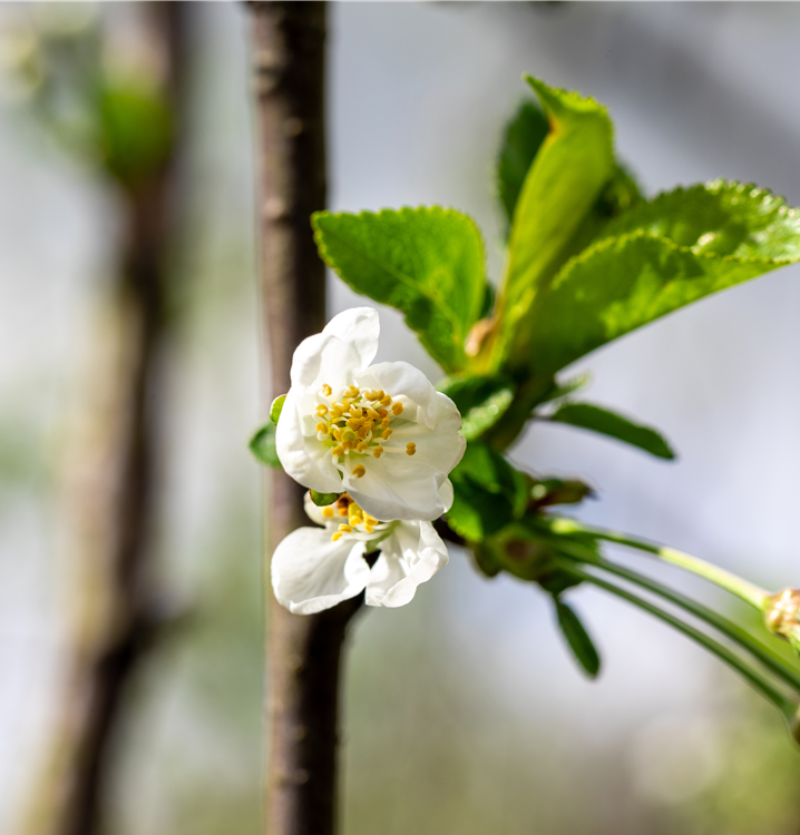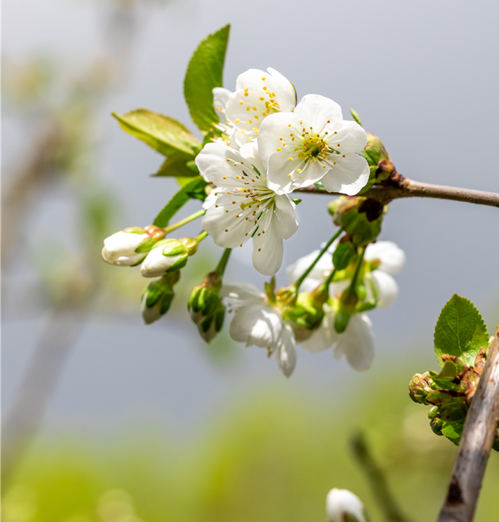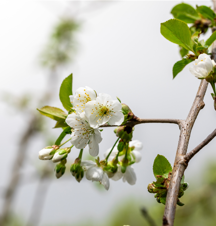 Prunus cerasus 'Schattenmorelle' bildet weiße Blüten ab April.