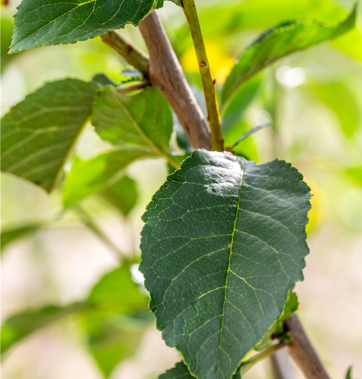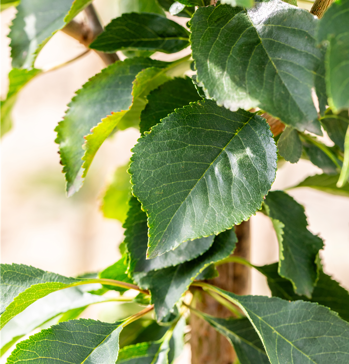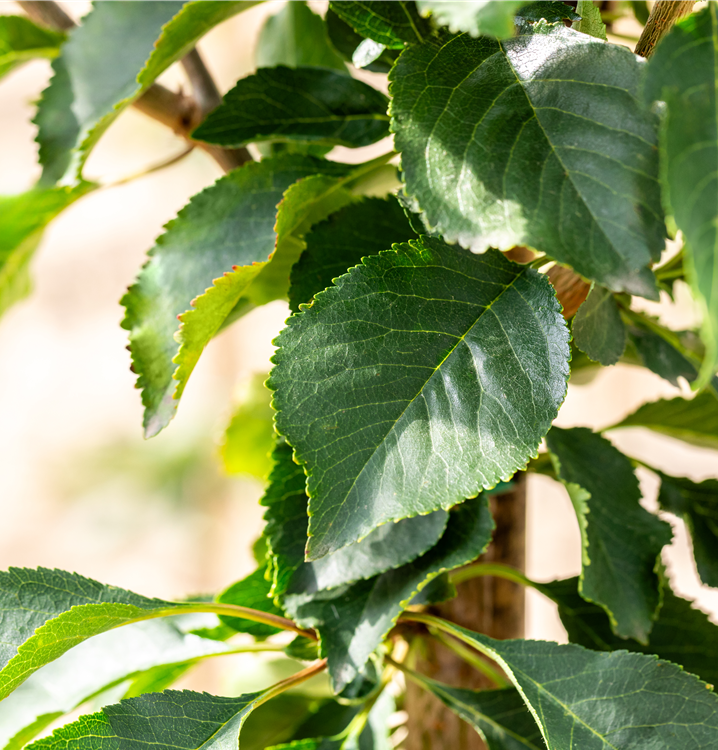 Die sommergrünen Blätter der Sauerkirsche 'Schattenmorelle' sind mittelgrün, eiförmig.