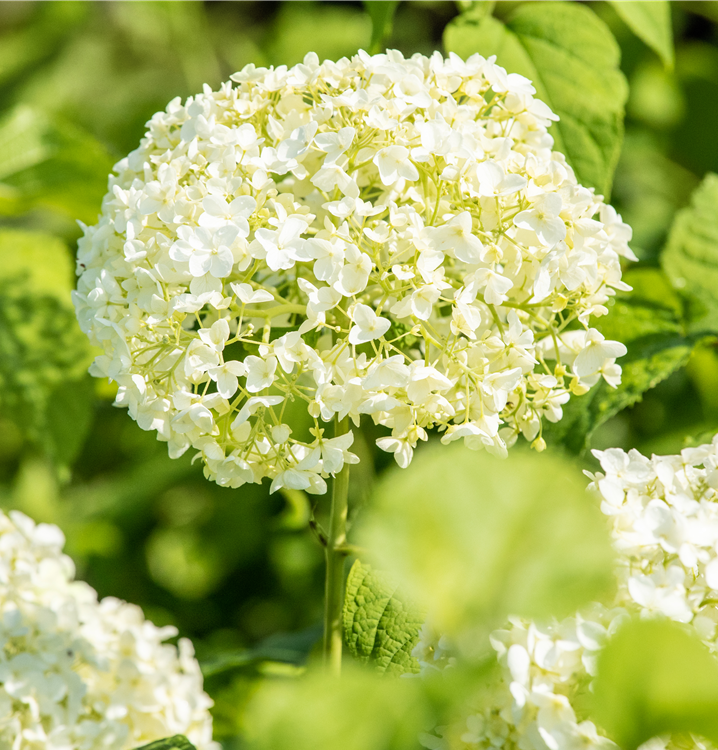Die Ballhortensie 'Annabelle' (Hydrangea arborescens) ist ein buschiger, aufrechter Strauch, der weiße, ballförmige Blüten hervorbringt. Sie erscheinen von Juli bis September. Zudem trägt die Ballhortensie 'Annabelle', eiförmige, hellgrüne Blätter. An einem sonnigen bis schattigen, windgeschützten Standort mit humosem, nährstoffreichem, schwachsaurem Boden erreicht sie gewöhnlich eine Höhe von ca. 2 m und wird ca. 1,5 m breit.