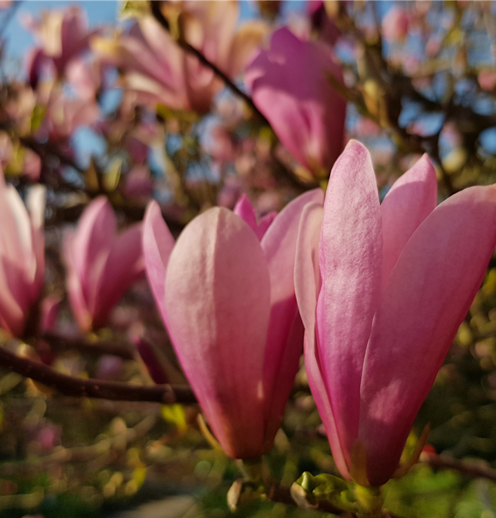 Die Tulpen-Magnolie (Magnolia x soulangiana) ist ein ausladender, breiter, malerischer Großstrauch mit dekorativen, roten Früchten. Diesen voraus bringt sie von April bis Mai hellrosafarbene, trichterförmige Blüten hervor. Zudem trägt die Tulpen-Magnolie, eiförmige, hellgrüne Blätter. An einem sonnigen bis halbschattigen Standort mit durchlässigem, kalkfreiem, nährstoffreichem Boden erreicht sie gewöhnlich eine Höhe von ca. 8 m und wird ca. 6 m breit.