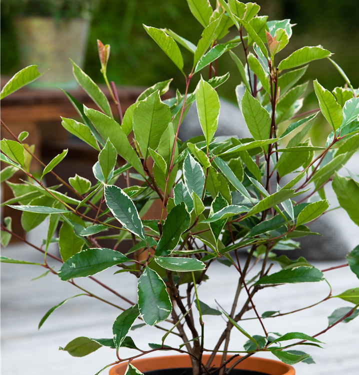 Hoher Blattschmuckwert. Die immergrünen Blätter der Glanzmispel 'Louise'(s) sind dunkelgrün, lanzettlich, glänzend und weisen einen weißen Rand auf. Rosa-roter Austrieb.