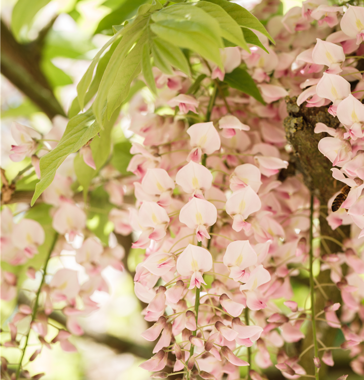 Die rosafarbenen Blüten des Edelblauregen 'Honbeni' erscheinen in Trauben von Mai bis Juni. Diese werden etwa 30 - 40 cm groß und sind angenehm duftend.