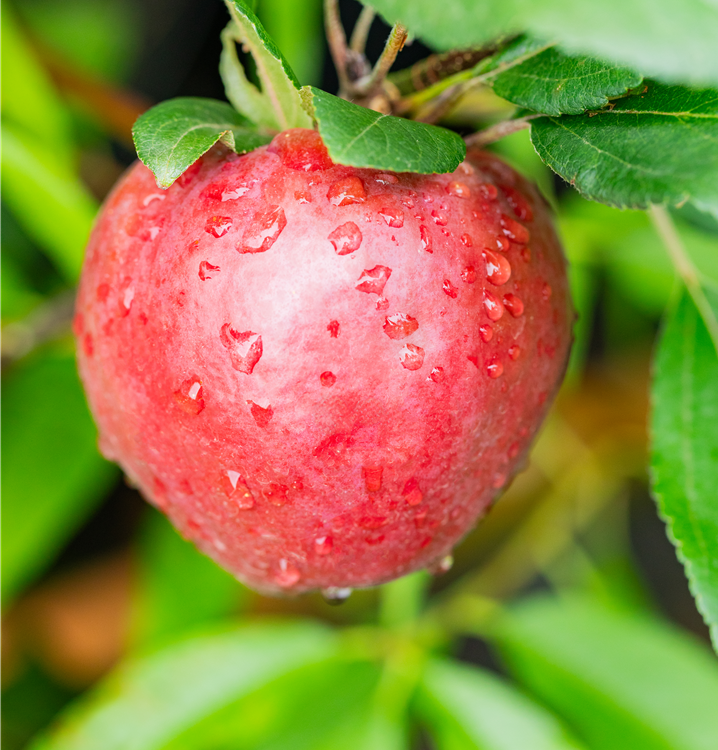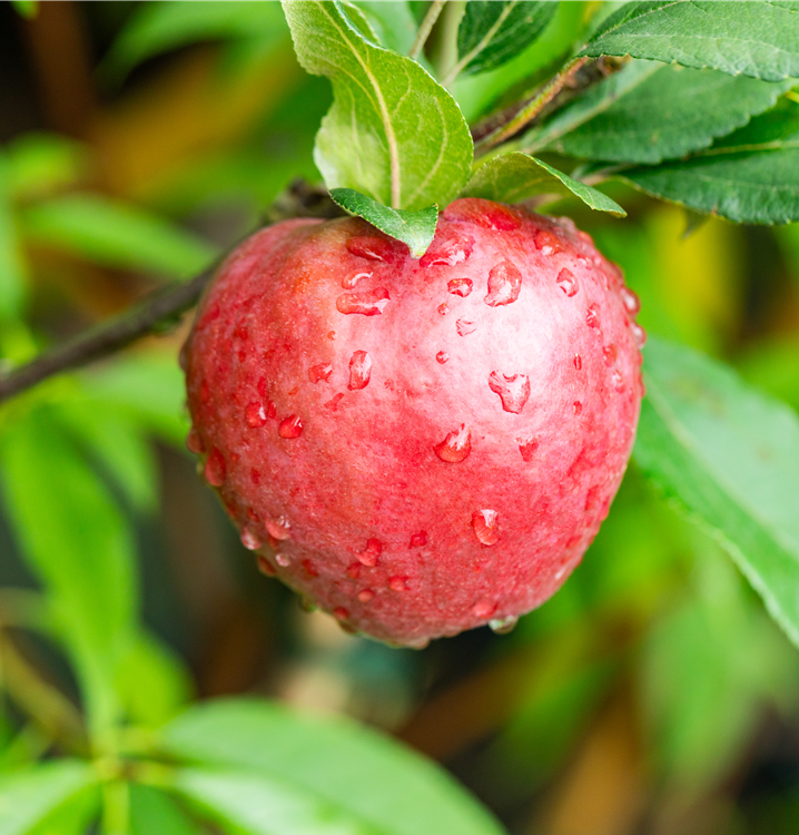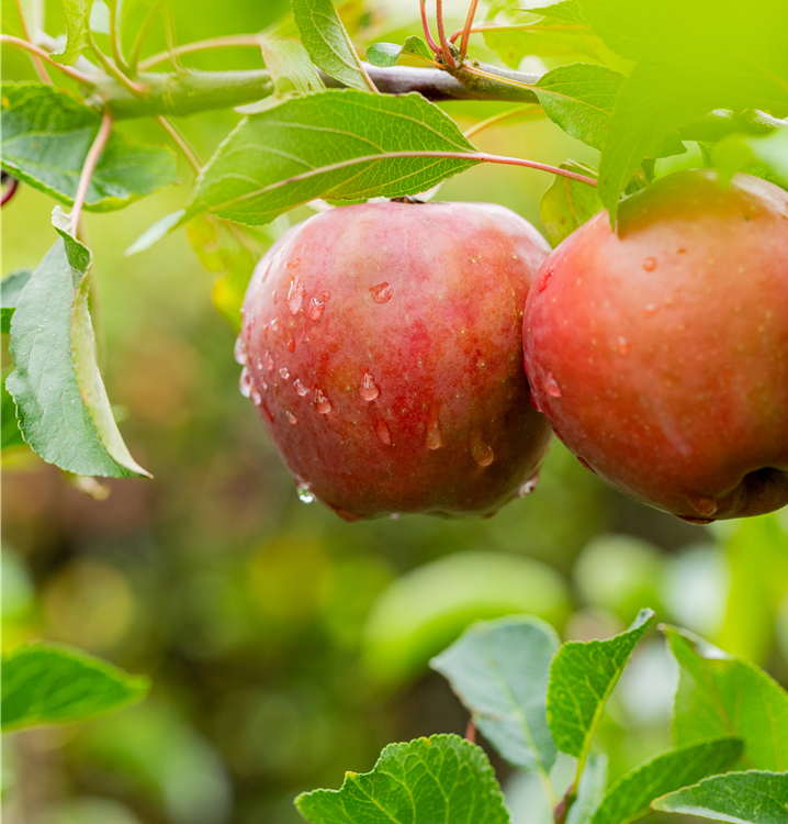 Der Apfel 'Baya® Marisa' (Malus domestica) bildet dunkelrote, knackige Früchte. Sie haben einen süß-säuerlichen, süßen Geschmack. Für eine ertragreiche Ernte ab September schaffen durchlässiger, nährstoffreicher Boden und ein sonniger bis halbschattiger Standort optimale Bedingungen. Seine hellrosafarbenen Blüten sind eine schöne Erscheinung. Der Apfel 'Baya® Marisa' wird mit seinem aufrechten und breiten Wuchs etwa 2,5 m hoch und 2 m breit.