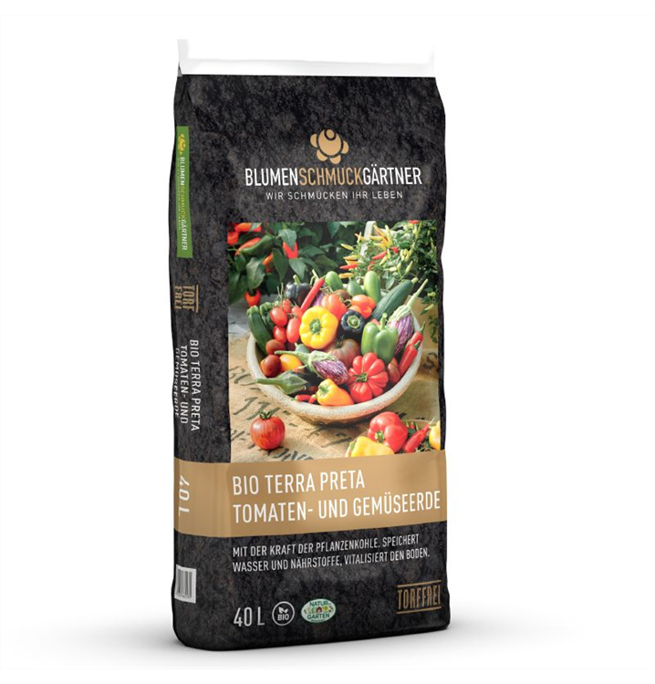 Bio Terra Preta Tomaten- und Gemüseerde ist ein gebrauchsfertiges, humusreiches Substrat für die Anwendung im Garten. Ideal für Pflanzarbeiten im Gemüsebeet, Hochbeet oder im Gartenboden, zum Pflanzen in Töpfe, Schalen oder zum Vermischen mit dem Bodenaushub im Pflanzloch beim Pflanzen von Stauden, Sträuchern, Bäumen oder Hecken. Ebenso gut auch zur dauerhaften Bodenverbesserung und auch ideal für Projekte zur Neuanlage von Pflanzflächen und zur Aufwertung des Bodens.