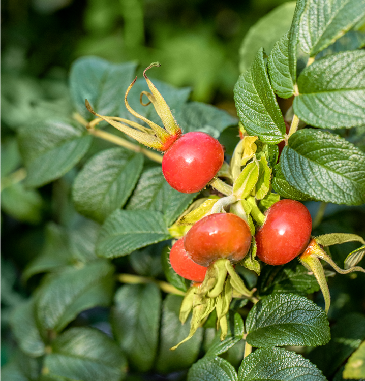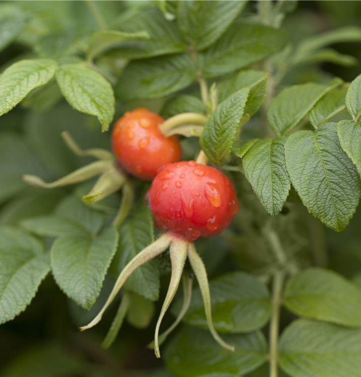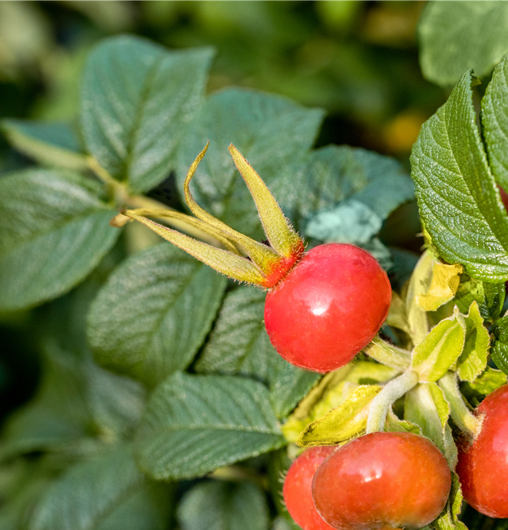 Besonders dekorativ sind die scharlachroten, runden Früchte von Rosa rugosa. Diese erscheinen ab Oktober.