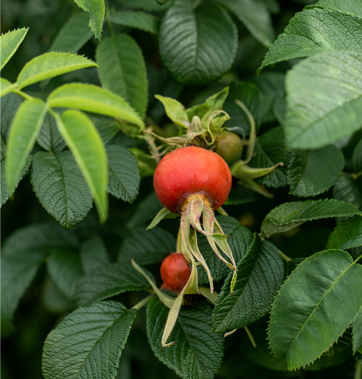 Die Apfel-Rose (Rosa) ist eine reichblühende Rose, die im Garten eine besondere Rolle spielt. Die zahlreichen Blüten sind rosa, weiß oder purpurrot und erscheinen von Juni bis Oktober. Ihr wunderbarer Duft entfaltet sich besonders an sonnigen, warmen Tagen. Zudem haben ihre runden, scharlachroten Früchte einen besonderen Zierwert, wenn sie ab Oktober reif sind. Mit dem aufrechten und straffen Wuchs wird dieser Strauch bis zu 2 m hoch und 1 m breit.