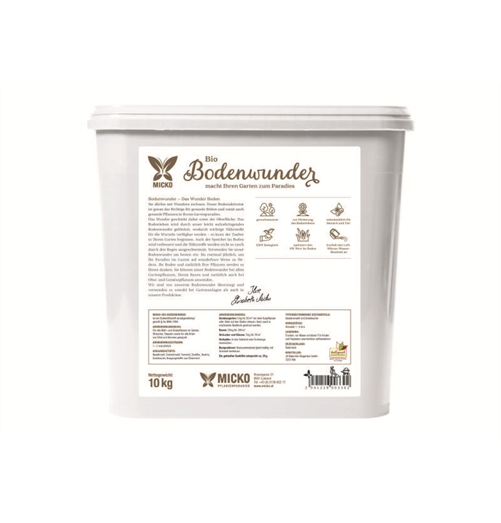 Sie dürfen mit Wundern rechnen. Unser Micko Bodenwunder ist genau das Richtige für gesunde Böden und Pflanzen in Ihrem Gartenparadies, denn das Bodenleben wird durch unser Bodenwunder gefördert - so kann der Zauber im Garten beginnen.