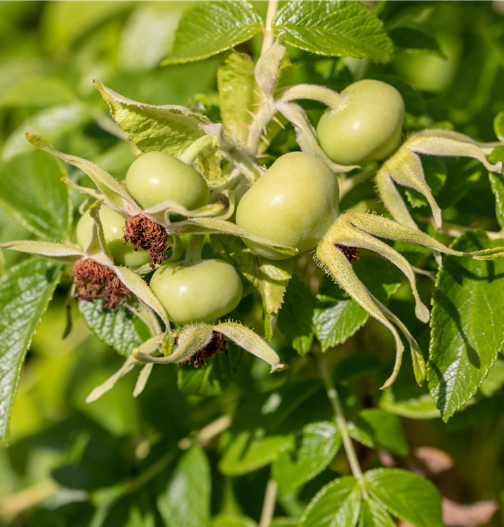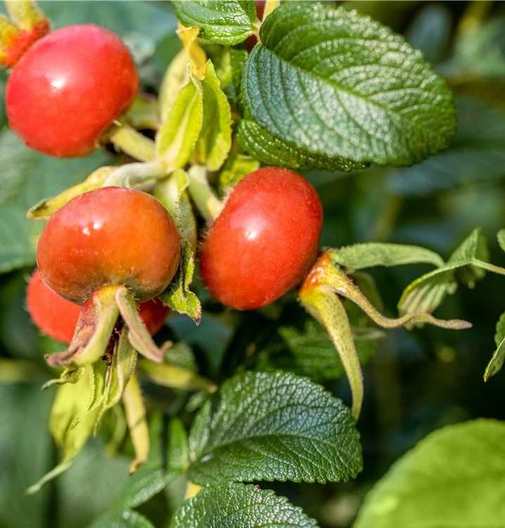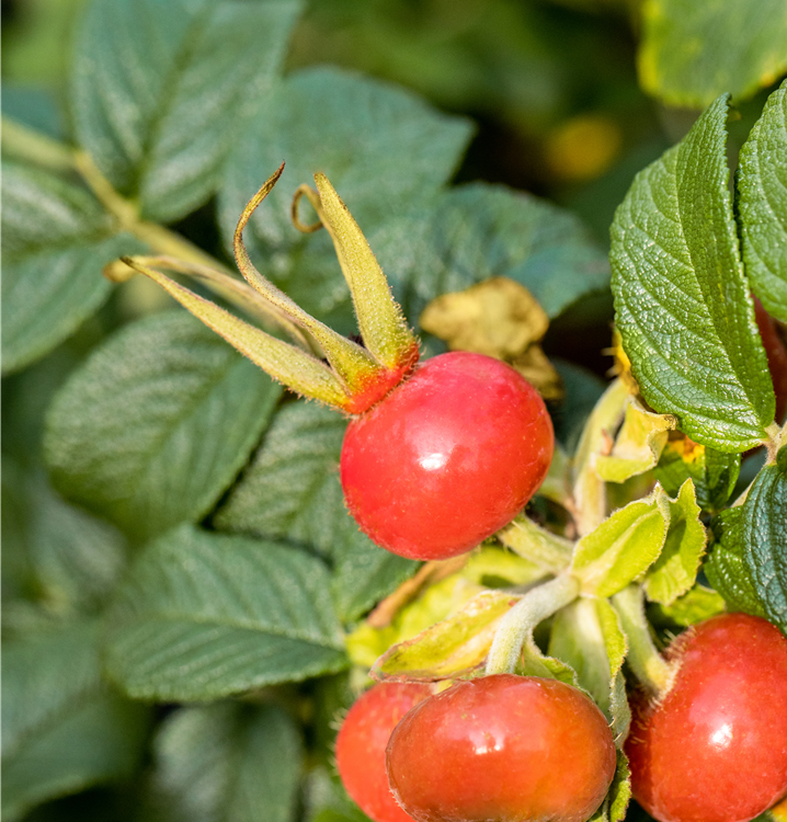Besonders dekorativ sind die orange-roten, runden Früchte von Rosa rugosa 'Alba'. Diese erscheinen ab Oktober.