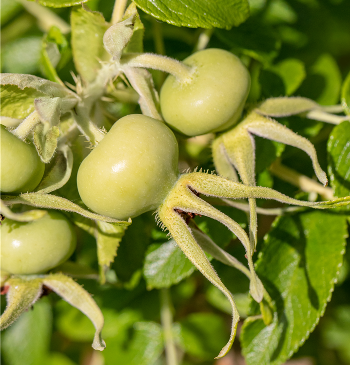 Die Weiße Apfelrose 'Alba' (Rosa) ist eine reichblühende Rose, die im Garten eine besondere Rolle spielt. Die zahlreichen Blüten sind weiß und erscheinen von Juni bis Oktober. Ihr wunderbarer Duft entfaltet sich besonders an sonnigen, warmen Tagen. Zudem haben ihre runden, orange-roten Früchte einen besonderen Zierwert, wenn sie ab Oktober reif sind. Mit dem aufrechten und straffen Wuchs wird dieser Strauch bis zu 1,5 m hoch und 1 m breit.