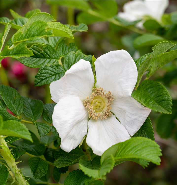 Die Triebe von Rosa rugosa 'Alba' sind bestachelt.