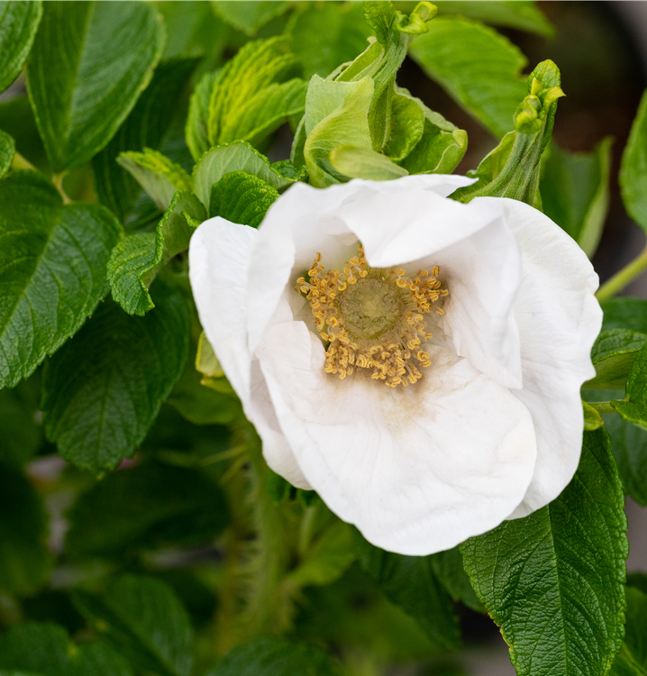 Die Weiße Apfelrose 'Alba' weist eine gute Frosthärte auf.