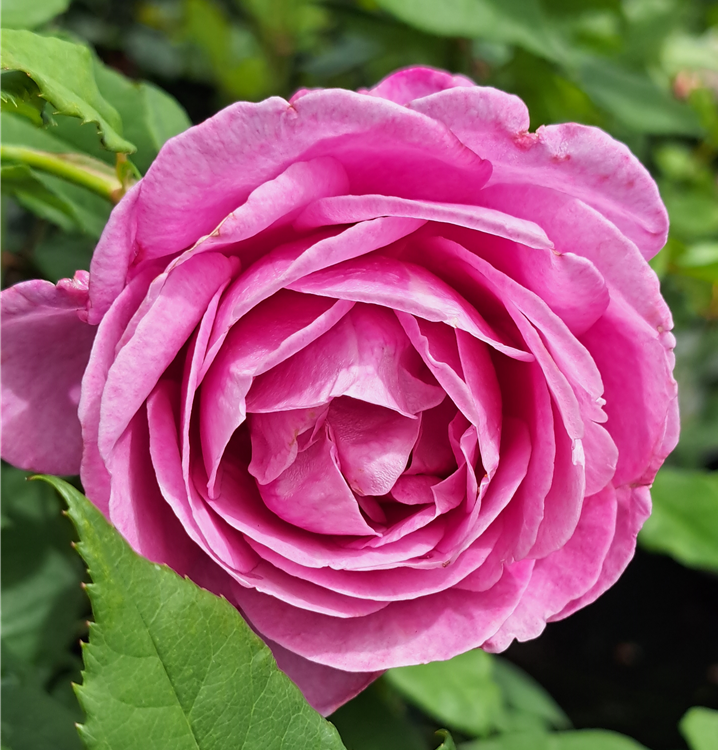 Die magentafarbenen, starkgefüllten, schalenförmigen Blüten der Beetrose 'Carmen Würth'(s) erscheinen in Dolden von Juni bis September. Diese werden etwa 6 - 8 cm groß und sind stark duftend.