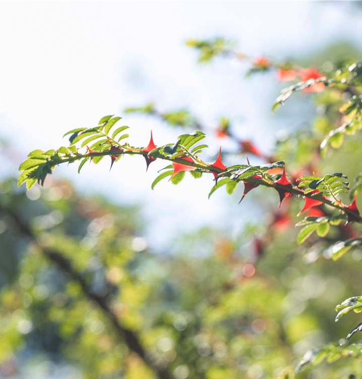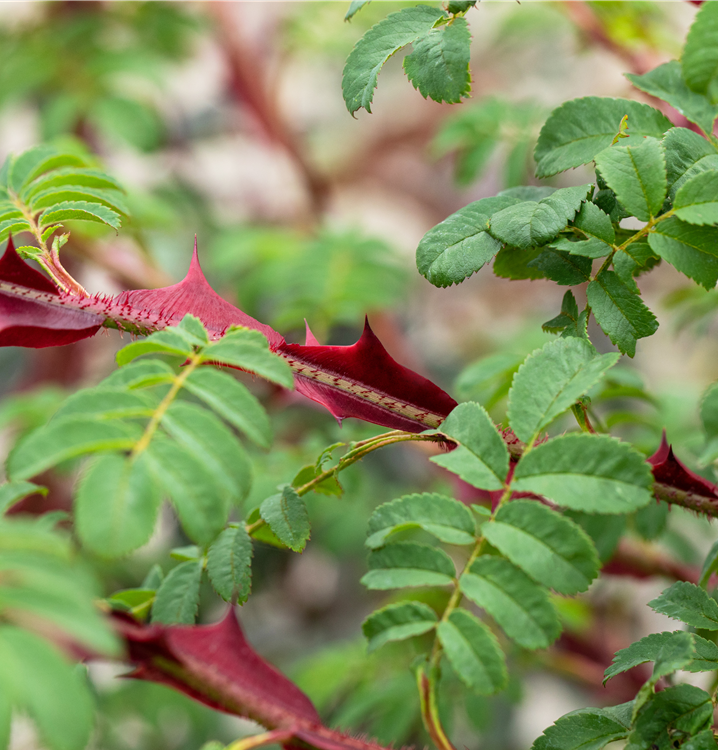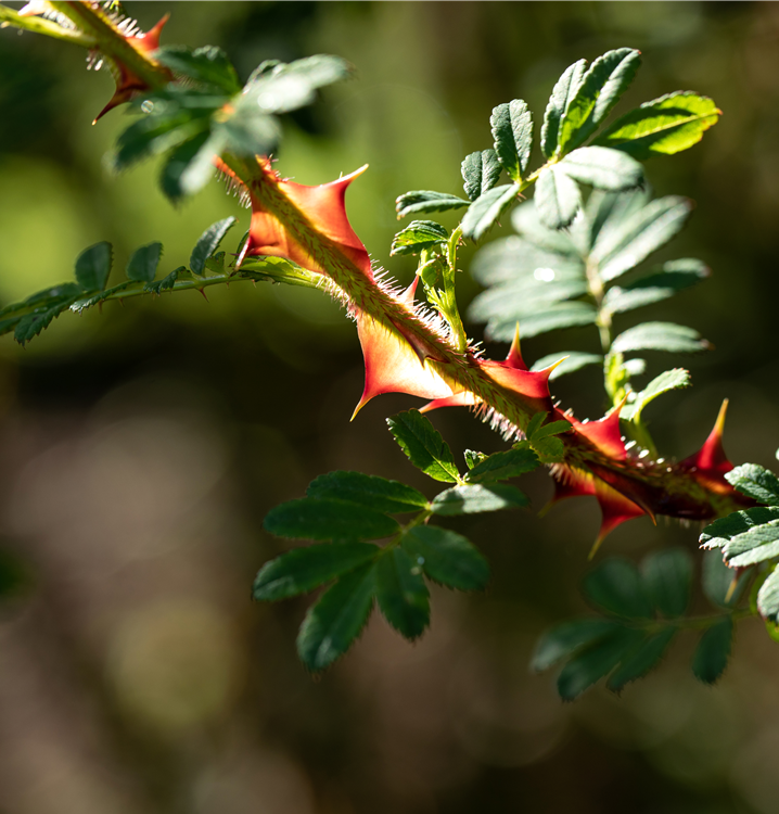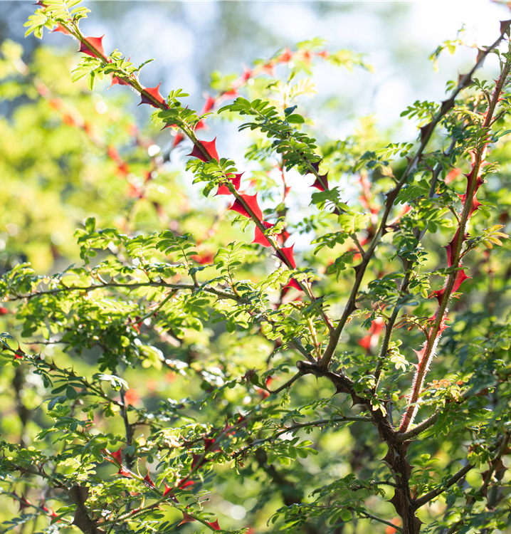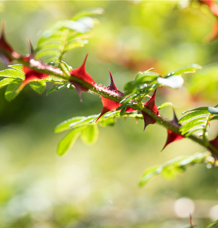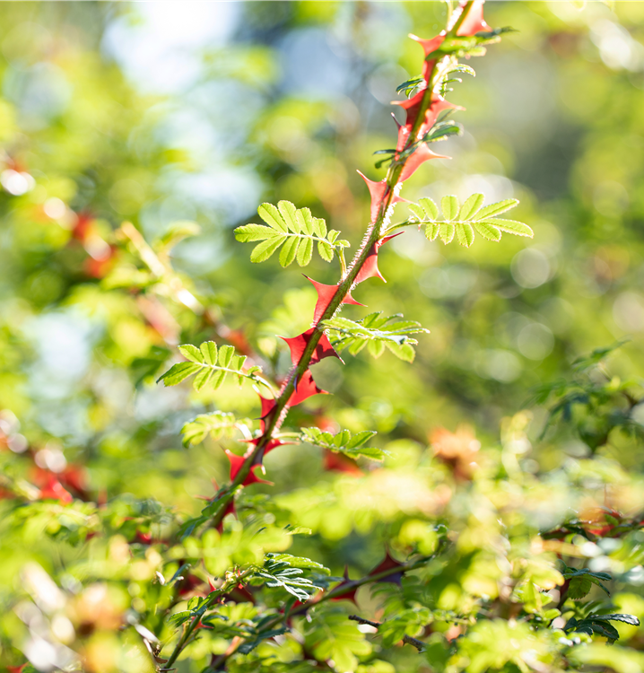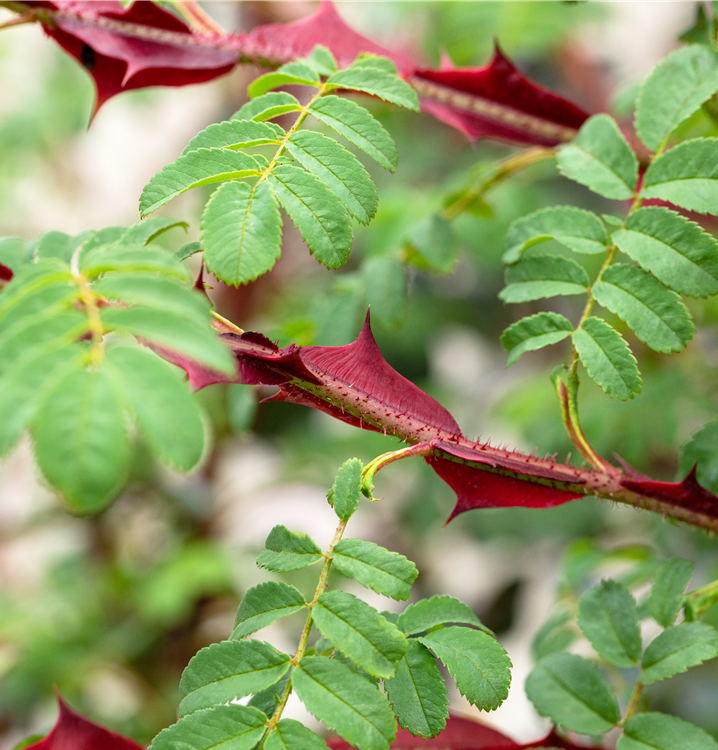 Die Triebe von Rosa sericea f. pteracantha sind bestachelt.