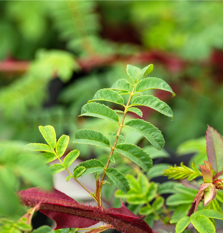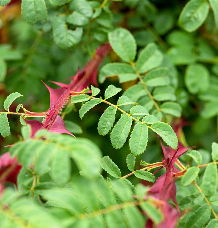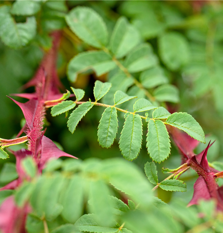 Die sommergrünen Blätter der Stacheldrahtrose sind dunkelgrün, gefiedert, wechselständig.