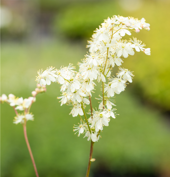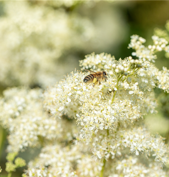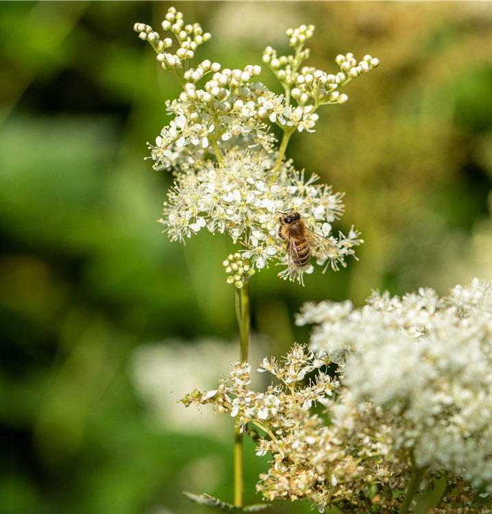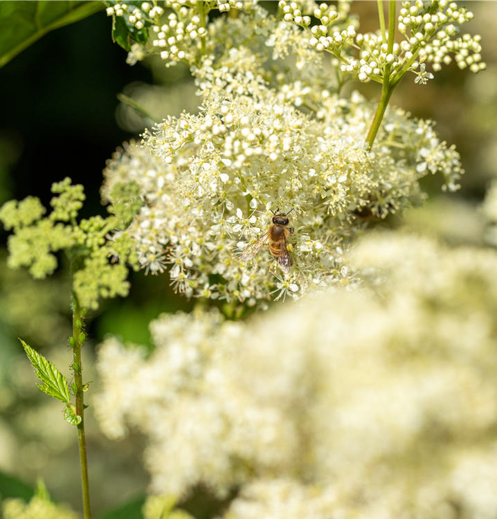 Filipendula ulmaria bildet in Rispen angeordnete, cremeweiße Blüten ab Juni. Diese verströmen einen angenehmen Duft.