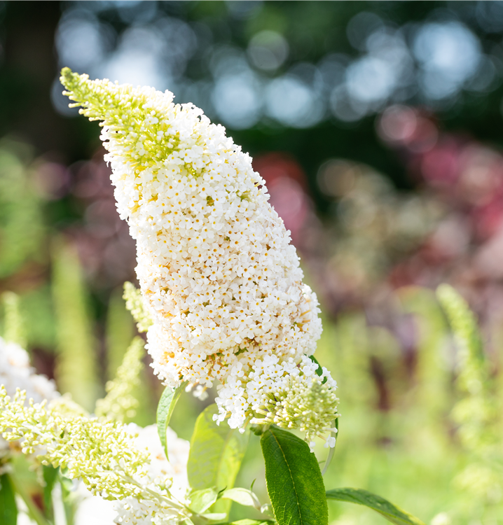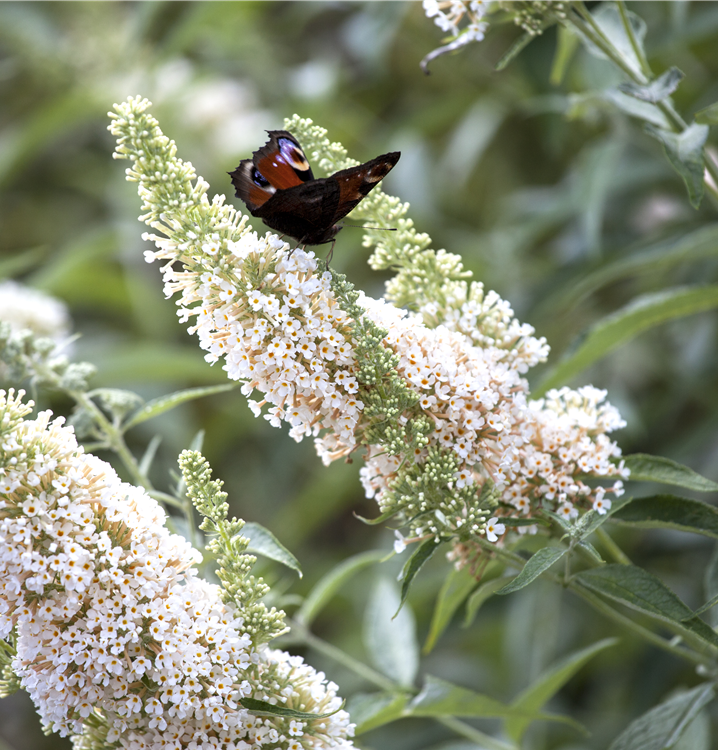 Die weißen Blüten des Sommerflieder 'White Profusion' erscheinen in Rispen von Juli bis September. Diese sind stark duftend.