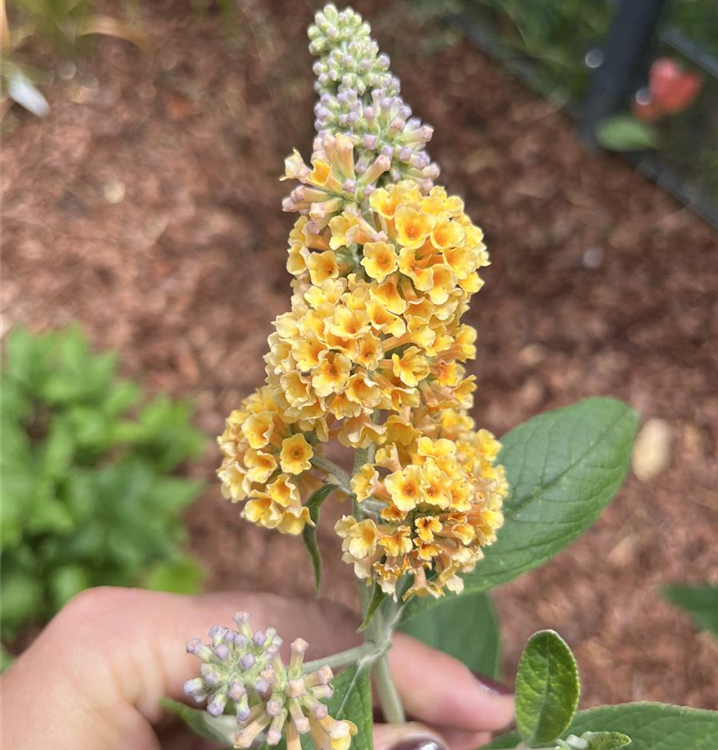 Die orangegelben Blüten des Sommerflieder 'Sungold' erscheinen in Rispen von Juli bis September. Diese werden etwa 15 - 20 cm groß und sind angenehm duftend.