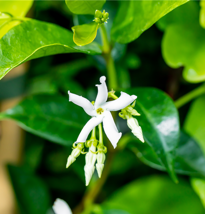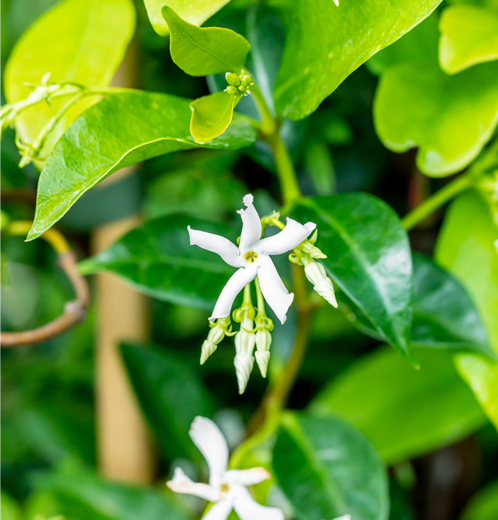 Trachelospermum jasminoides bildet weiße Blüten ab Juni. Diese verströmen einen angenehmen Duft.