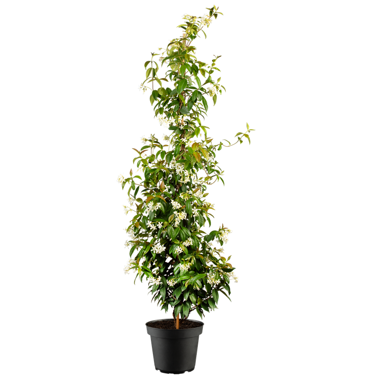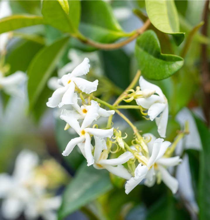 Der Sternjasmin (Trachelospermum jasminoides) ist eine sehr beliebte, immergrüne Kübelpflanze. Seine dekorativen Blüten erscheinen von Juni bis August. Sie verströmen einen angenehmen Duft. Die dunkelgrünen Blätter sind lanzettlich und glänzend. Der Standort sollte möglichst sonnig bis halbschattig sein. Eine durchlässige Erde ist dabei ideal. Bei günstigen Bedingungen erreicht der Sternjasmin eine Höhe von ca. 4 m.