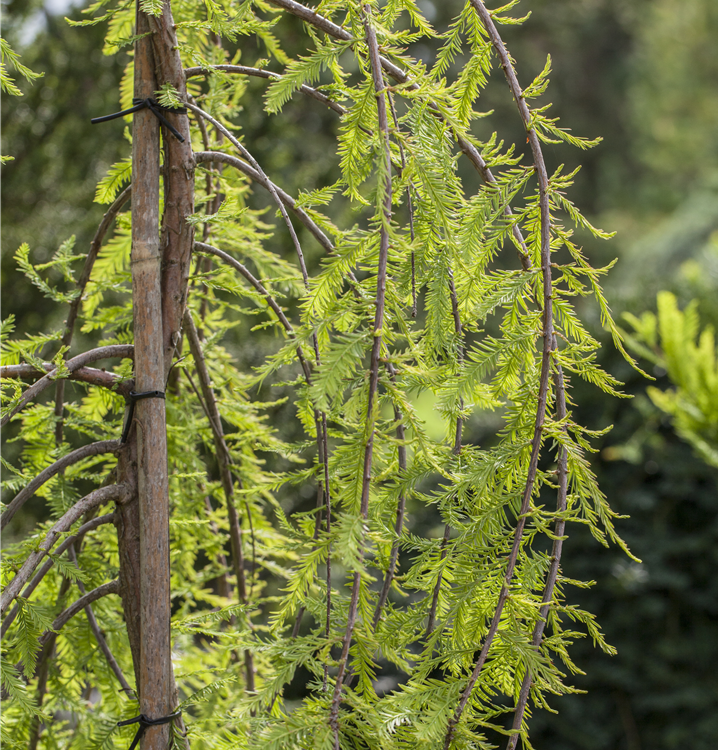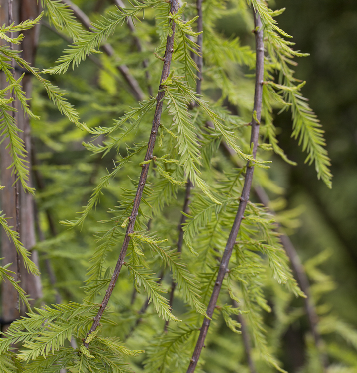Die Sumpfzypresse 'Pendulum' ist sommergrün. Ihre Nadeln sindmittelgrün, wechselständig. Sumpfzypresse 'Pendulum' zeigt sich leuchtend rot-braun im Herbst.