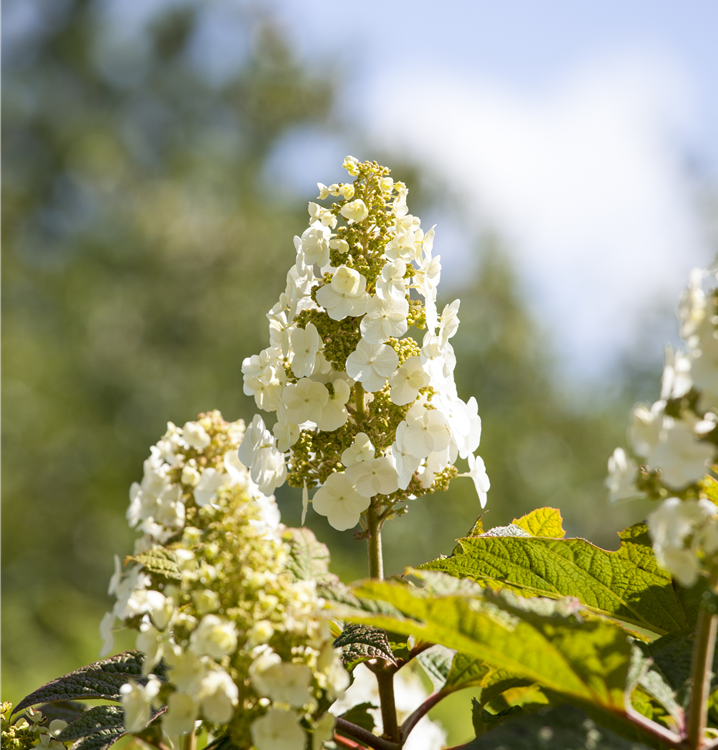 Die weißen, später rosafarbenen Blüten der Eichenblättrigen Hortensie 'Munchkin' erscheinen in Rispen von Juni bis Juli. Diese werden etwa 10 - 20 cm groß und sind leicht duftend.