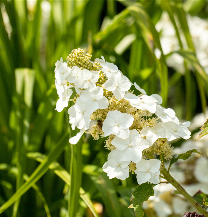 Die weißen, später rosafarbenen Blüten der Eichenblättrigen Hortensie 'Ruby Slippers' erscheinen in Rispen von Juni bis August. Diese werden etwa 10 - 20 cm groß und sind leicht duftend.