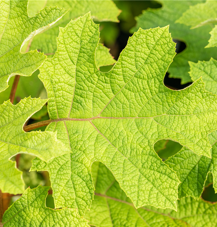 Die sommergrünen Blätter der Eichenblättrige Hortensie 'Ruby Slippers' sind dunkelgrün, eiförmig, gegenständig, gelappt. Eichenblättrige Hortensie 'Ruby Slippers' zeigt sich leuchtend purpurrot im Herbst.