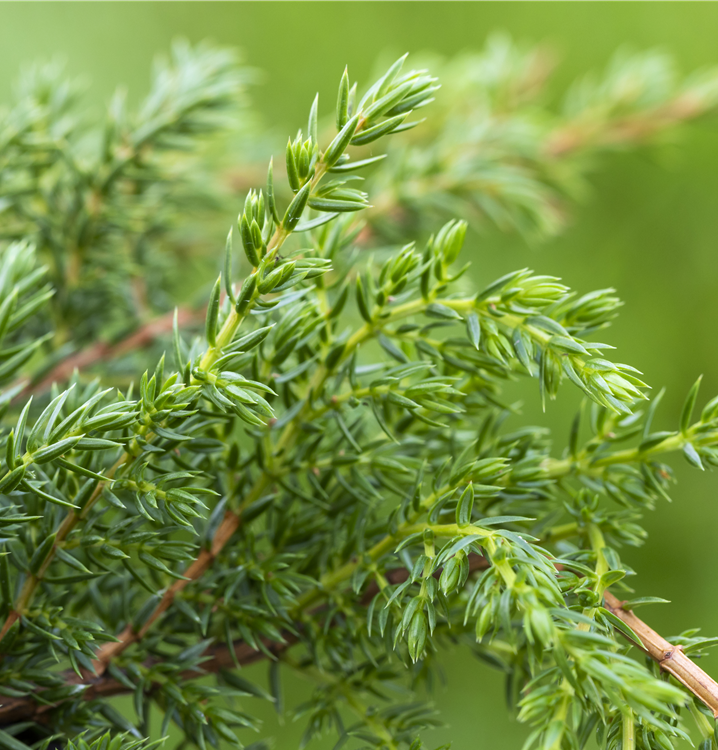 Sehr dekorativ. Der Zwergwacholder 'Holger' ist immergrün. Seine Nadeln sind blau-grün. Hellgelber Austrieb.