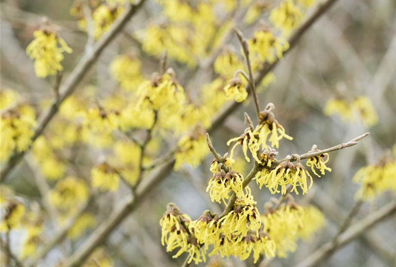 Warum sich Schneeball, Winter-Jasmin und Co. ausgerechnet in einer solch unwirtlichen Jahreszeit dermaßen in Schale werfen, ist schnell erklärt: Die Konkurrenz ist geringer. Während im Sommer unzählige Blütenschönheiten um die Gunst von Bienen, Hummeln und anderen Insekten buhlen, ist das Angebot für die Bestäuber im Winter und Frühjahr so begrenzt, dass sich jede noch so unscheinbare Blüte ihrer ungeteilten Aufmerksamkeit sicher sein kann. Aber was heißt da eigentlich unscheinbar: Viele Frühblüher haben sich sogar ausgesprochen auffällige Blütenkleider zugelegt. Die Zaubernuss ( Hamamelis x intermedia ) beispielsweise trägt im Januar und Februar eine regelrechte Punk-Frisur: Ihre gefransten Blütenschöpfe leuchten je nach Sorte in Gelb, Orange oder Rubinrot und duften so verführerisch, dass man sich unbedingt ein Exemplar in der Nähe des Hauseingangs oder im Pflanzgefäß auf der Terrasse gönnen sollte.