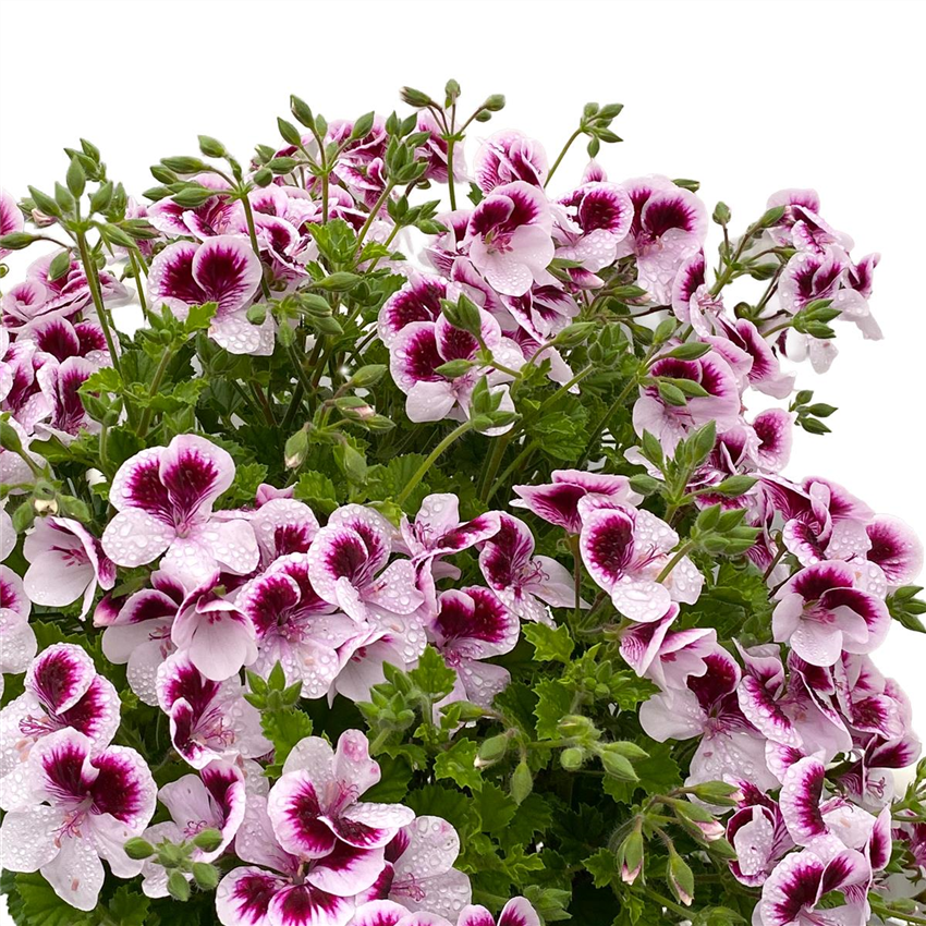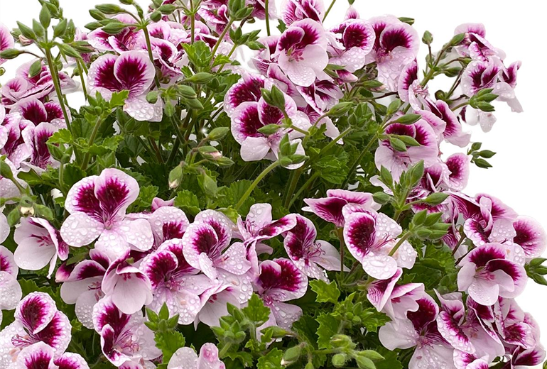 Wer sie zudem in Gesellschaft von duftenden Kräutern wie Lavendel, Zitronenmelisse oder Rosmarin pflanzt, schafft ein harmonisches, angenehm riechendes Pflanzenensemble. Besonders schön wirken daneben auch Thymian, Salbei oder Oregano, deren mediterranes Flair den Charakter der Duftpelargonie perfekt unterstreicht. In Blumentöpfen oder Hochbeeten lassen sich zudem Kombinationen mit Kapuzinerkresse, Verbenen, Duftsteinrich oder der silbrig herabhängenden Dichondra ‘Silver Falls’ (Silberregen) gestalten. Ihre weichen, silbrigen Triebe setzen einen edlen Kontrast zum frischen Grün der Pelargonie und sorgen für einen besonders eleganten, harmonischen Gesamteindruck. Auch in der Nähe von Zitronenverbene, Minze oder Basilikum entsteht so ein lebendiges Duft- und Farbarrangement, das alle Sinne anspricht.