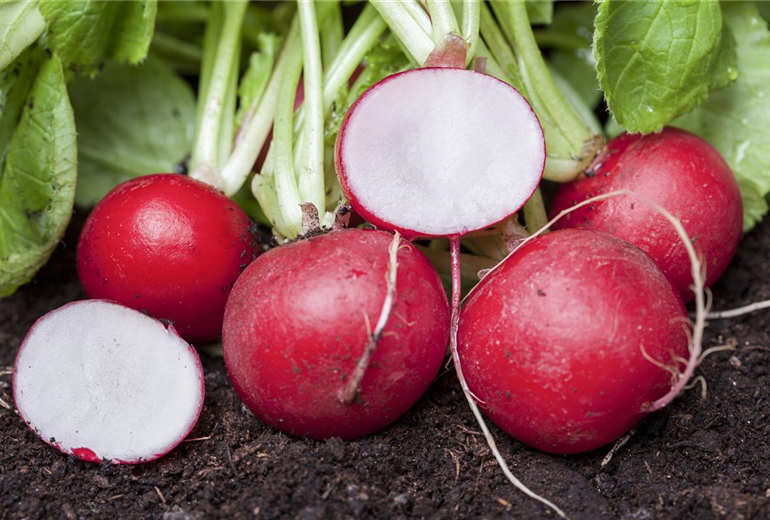 Wenn es beim Keimen und Wachsen von Gemüse ein Wettrennen gäbe, dann stünde das Radieschen jedes Mal siegessicher auf Platz Eins. Innerhalb von 6-10 Tagen keimt das Wurzelgemüse und ist nach ca. 4-5 Wochen erntereif. Die Aussaat erfolgt von Mitte März bis September direkt ins Freiland. Die knackigen Leckerbissen gibt es nicht nur in Rot und rund; probieren Sie doch auch mal zweifarbige Sorten in Rot-Weiß, längliche in Zapfenform oder eine mehrfarbige Mischung mit gelben, violetten und weißen Radieschen.