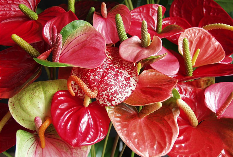 Die in den Tropen beheimatete Flamingoblume gilt als äußerst dankbare Schnittblume. Leuchtende Blätter umschließen den Blütenkolben, der sich aus unscheinbaren Einzelblüten in Gestalt kleiner Höcker zusammensetzt. Gerade in den letzten Jahren haben die Züchter viele neue Sorten auf den Markt gebracht – vor allem die kleinblütigen Sorten lassen sich in gemischten Sträußen wunderbar verwenden. Die Blätter finden außerdem in der Floristik Verwendung.