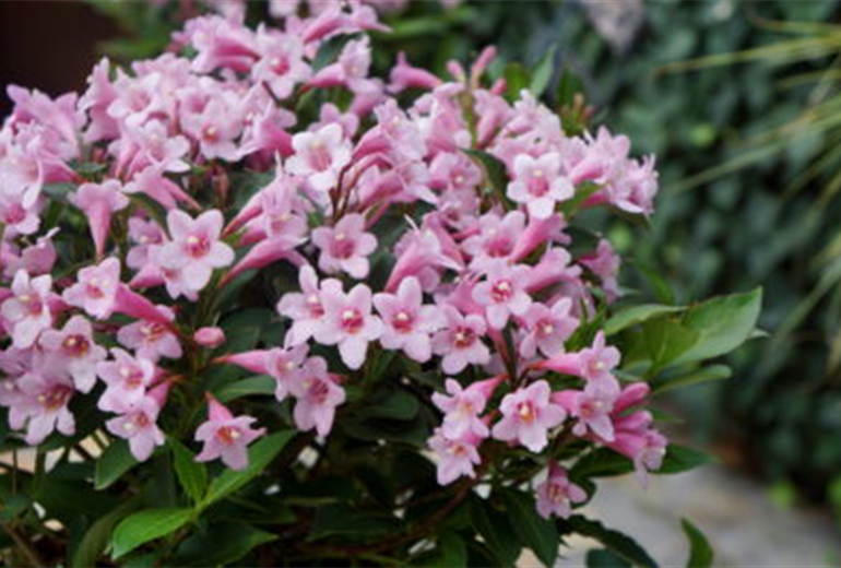 Die zarten, trichterförmigen Blüten bedecken fast den ganzen Strauch, der Sie im Frühling, aber auch ein zweites Mal im Herbst mit seiner zierlichen Blütenpracht erfreuen wird. Überreich blühend und winterhart macht die Weigelie in Beeten, aber auch in Pflanzgefäßen auf Balkon oder Terrasse eine wunderbare Figur. „Pink Poppet®“mag außerdem einen sonnigen Standort und fühlt sich besonders wohl in guten, nährstoffreichen Gartenböden.