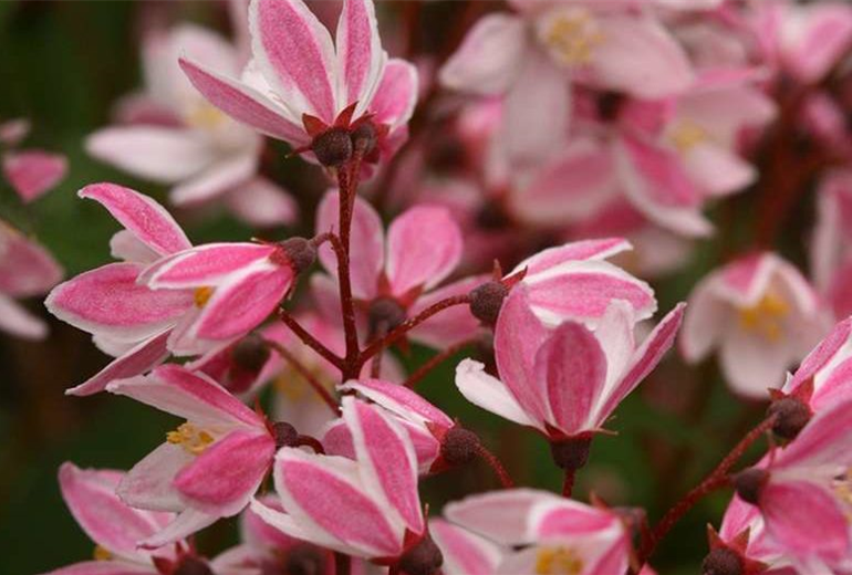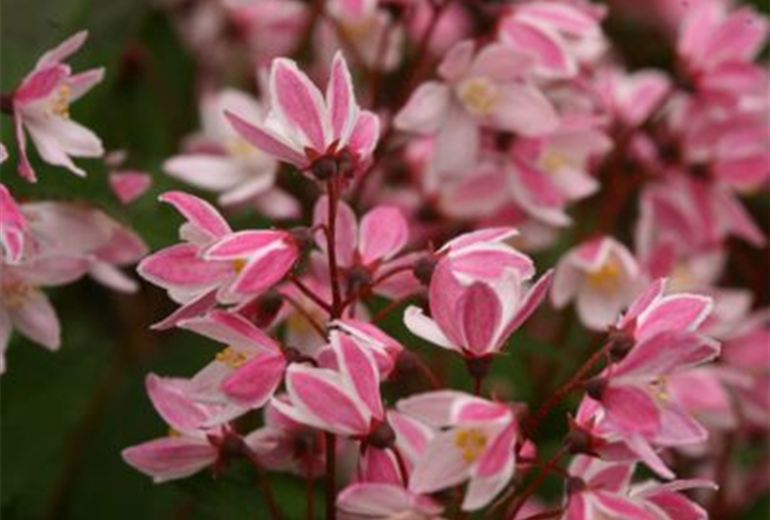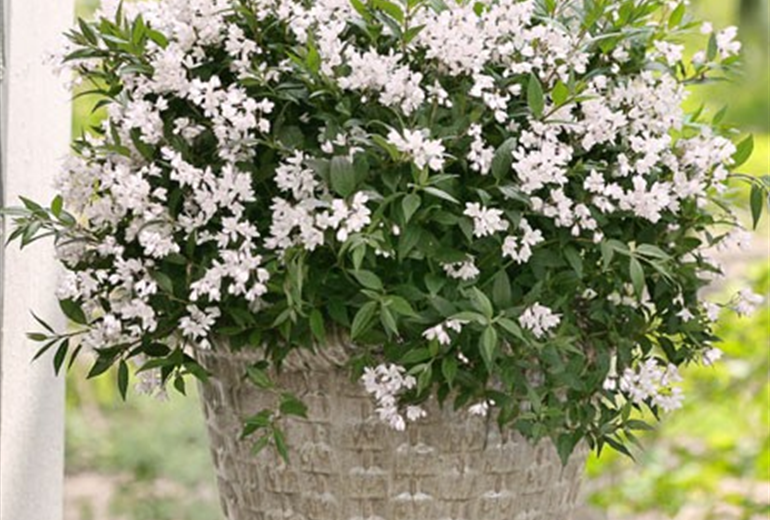 An Lieblichkeit kaum zu übertreffen! Der Maiblumenstrauch „Yuki Cherry Blossom®“ zählt wahrscheinlich zu den bezauberndsten Ziergehölzen, die es gibt. Sternchenförmig sind sie, die Blüten, und verzaubern Besitzer und Betrachter durch ihre lieblich rosa Blütenblätter, die mit einem zarten, weißen Rand eingefasst sind. Von Mai bis Juli kann man sich an den hängenden Blütenrispen erfreuen. Der kleine, rundlich wachsende Zwergstrauch gedeiht an sonnigen sowie halbschattigen Plätzen und fühlt sich sowohl im Staudenbeet als auch in Kübeln auf Terrasse oder Balkon wohl. Die purpurbronzefarbene Herbstfärbung des Maiblumenstrauchs ist eine wirkliche Besonderheit und zeigt einmal mehr: „Yuki Cherry Blossom®“ muss man einfach (gern-)haben!