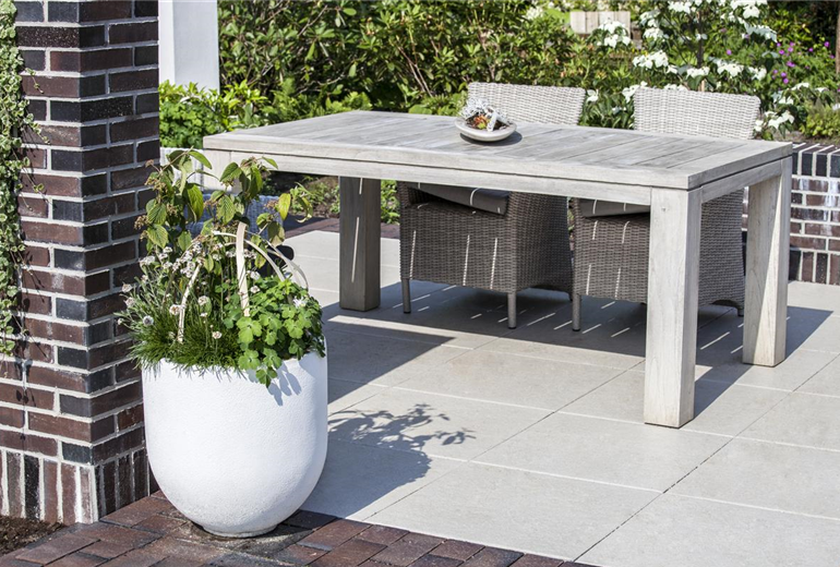 Der Hauptsitz im direkten Anschluss ans Gebäude erweitert den Wohnraum optimal nach außen; kurze Wege, z.B. zur Küche, sind dabei von Vorteil. Die Gestaltung hängt vom Stil des Hauses und des Gartens ab. Wählen Sie Materialien, die dazu passen. Außerdem sollte die Terrasse eine ebene befestigte Fläche sein, damit Tisch und Stühle sicher stehen. Am beliebtesten sind Naturstein-, Klinkerstein- oder Betonsteinbeläge, denn sie sind robust und pflegeleicht und man kann jegliche Formen damit kreieren. Ein Terrassenbelag aus Holz hat eine warme, natürlich Ausstrahlung; leider ist etwas Pflege notwendig, damit er seine Schönheit behält. Mittlerweile finden Sie aber auch Dielen aus Kunststoff in Holzoptik, die dem natürlichen Werkstoff zum Verwechseln ähnlich sehen und ewig halten.