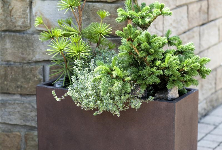 So hübsche Namen wie Mopskiefer, oder Thuja occidentalis 'Teddy' machen Zwergkoniferen sehr sympathisch. Sie bilden hübsche kugelige und filigrane Sträucher, die Balkonkästen und Gärten ganzjährig schmücken. Mit einer dekorativen Lichterkette und saisonalen Dekoelementen ergänzt, können Sie Ihren Balkon das ganze Jahr mit wenig Aufwand und Pflege zum Erstrahlen bringen.