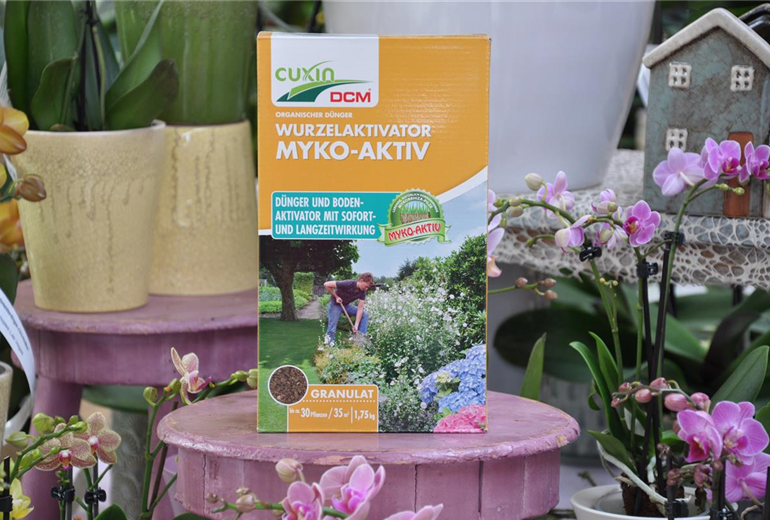 „Myko-Aktiv“ ist ein Dünger mit lebenden Mykorrhiza-Pilzen. Der Pilz, der in oder um die Pflanzenwurzeln herum wächst, stellt den Pflanzen Wasser und Nährstoffe zur Verfügung, während die Pflanze ihrerseits den Pilz mit Kohlen- hydraten und Pflanzenvitaminen versorgt. Die Pflanzen wachsen besser, blühen viel prächtiger und länger und tragen größere Früchte, wenn sie in Symbiose mit geeigneten Pilzen leben.